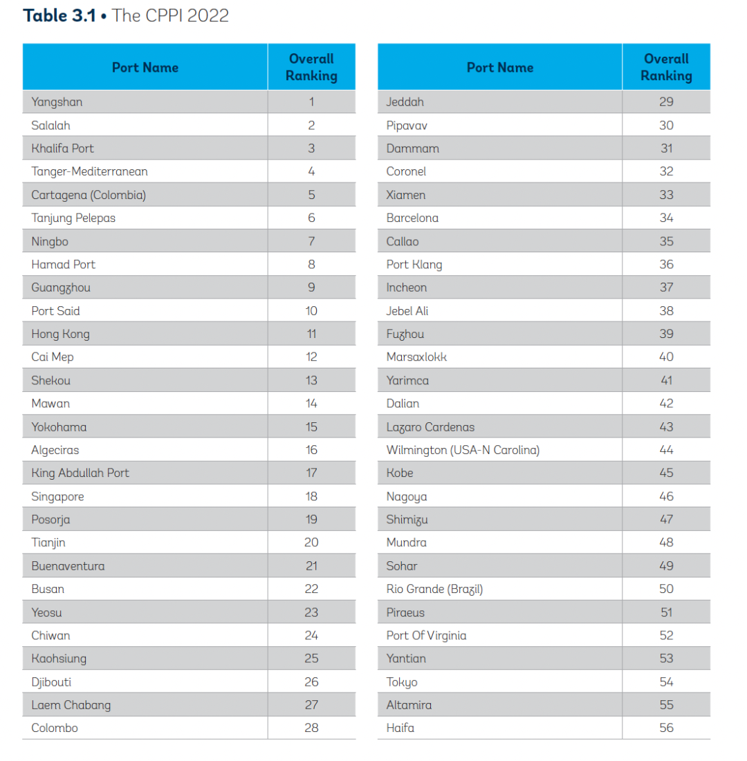 附:cppi 2022排名前100位的集装箱港口